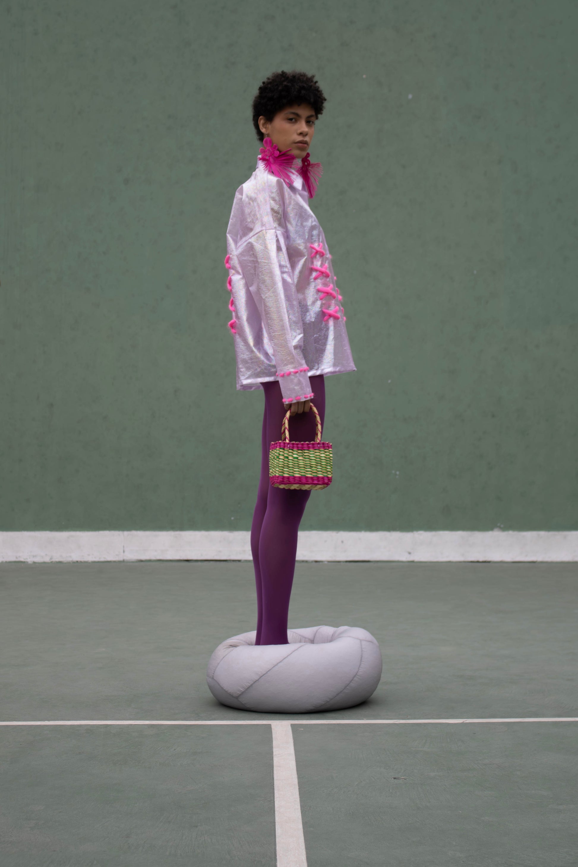 Composition: Certified 100% Mecha Wool details, paired with lightweight foliate organza. A natural fusion of strength and delicacy, sourced and crafted in Peru.