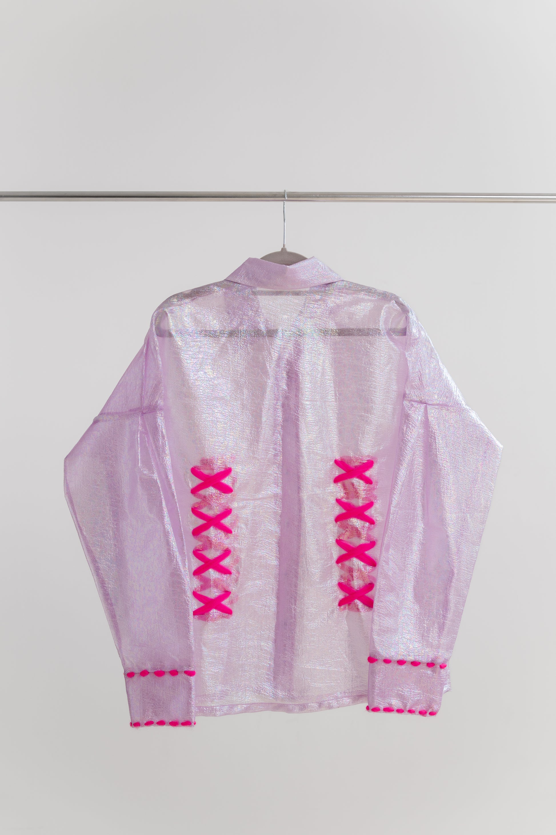 A celebration of timeless beauty and Peruvian artistry. Crafted in Peru from locally sourced Organza and finished with 100% Mecha wool lace-ups along the front and back, each piece embodies true artisanal mastery. Elegant yet versatile, it can be worn alone with a touch of transparency or layered as a lightweight outer shell. A modern statement piece for those who value craftsmanship with soul.